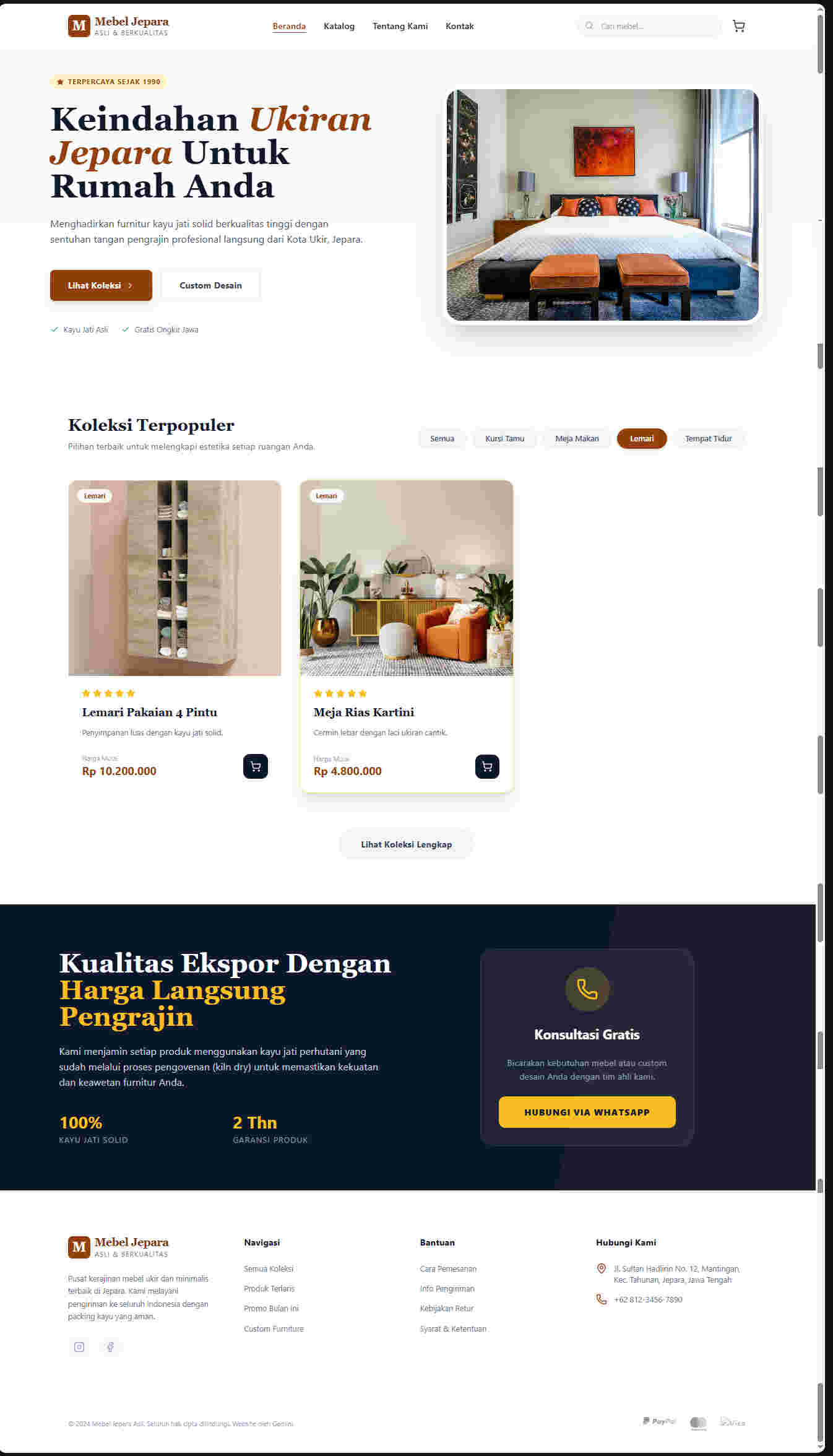 Fitur “Hubungi via WhatsApp” di area gelap (footer) memberikan kontras visual yang menarik perhatian. Ini sangat krusial bagi UMKM, karena pembelian furnitur seringkali membutuhkan diskusi panjang mengenai dimensi, warna finishing, hingga biaya pengiriman.